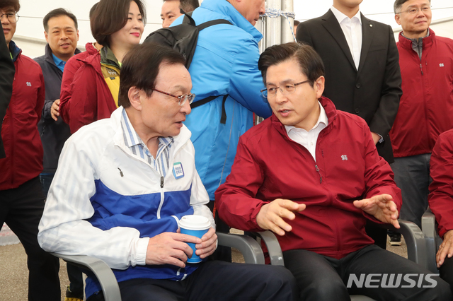 【서울=뉴시스】박미소 기자 = 더불어민주당 이해찬 대표(왼쪽)와 자유한국당 황교안 대표(오른쪽)가 1일 오전 서울 여의도공원에서 열린 한국노총 2019 노동절 마라톤대회에서 대화하고 있다. 2019.05.01.