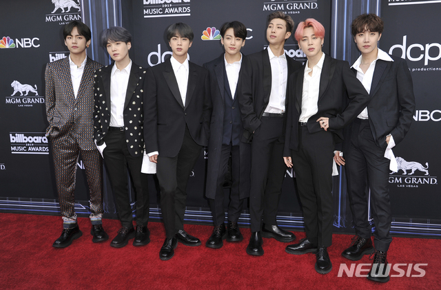 【라스베이거스=AP/뉴시스】방탄소년단(BTS)이 1일(현지시간) 미 네바다주 라스베이거스 MGM 그랜드 가든 아레나에서 열린 2019 빌보드 뮤직어워드(BBMA)에 참석해 레드카펫에 올라 포토타임을 갖고 있다. 2019.05.02.