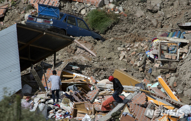 【라파스(볼리비아)=AP/뉴시스】1일(현지시간) 볼리비아 행정수도 라파스에서 산호르헤 칸투타니 인근 언덕 꼭대기가 산사태로 무너져내린 가운데 주민들이 잔해 속에서 개인 소지품을 찾고 있다.