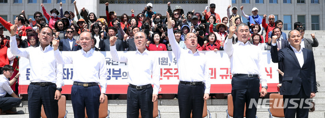 【서울=뉴시스】 박영태 기자 = 2일 오전 서울 여의도 국회 본청 앞에서 진행된 자유한국당 의원들이 패스트트랙 법안 철회를 위한 삭발을 한 후 구호를 외치고 있다. 오른쪽부터 박대출, 윤영석, 이장우, 김태흠, 성일종 의원, 이창수 천안병 당협위원장. 2019.05.02.