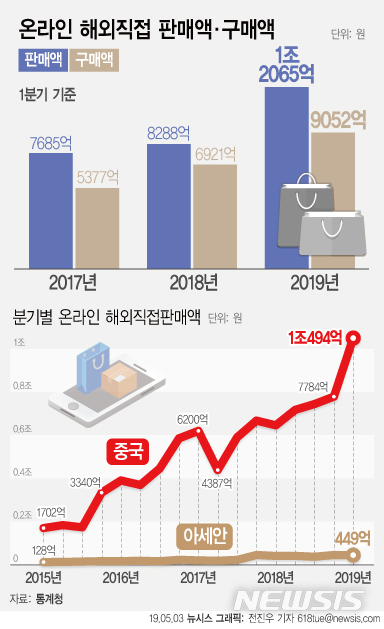 【서울=뉴시스】3일 통계청이 발표한 '2019년 3월 및 1분기 온라인쇼핑 동향'에 따르면 올해 1분기 온라인 해외 직접 판매액은 1조2065억원으로 1년 전보다 45.6% 증가했다. (그래픽=전진우 기자)
