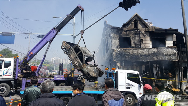 【아산=뉴시스】이종익 기자 = 3일 오전 8시 46분께 충남 아산시 온천동의 한 건축자재 창고에서 발생한 화재현장에서 레저차량(RV) 운전자로 추정되는 사망자가 발생해 경찰이 수사에 나섰다. 2019.05.03. (사진=독자 제공)