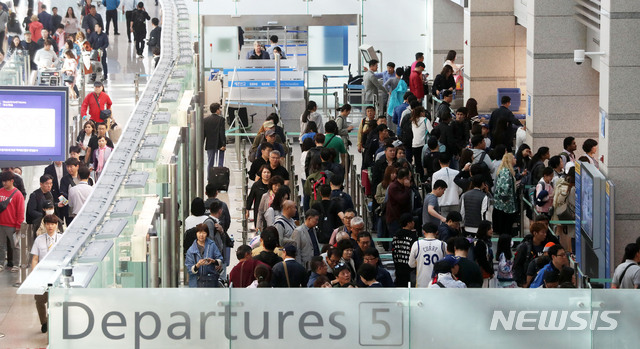 【인천공항=뉴시스】홍효식 기자 = 5월 어린이날 연휴를 하루 앞둔 3일 오전 인천국제공항 제1터미널 출국장에 여행객들로 북적이고 있다. 2019.05.03. [email protected]