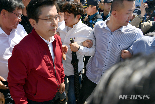 【광주=뉴시스】류형근 기자 = 자유한국당 황교안 대표가 3일 오전 광주 광산구 광주송정역광장에서 '문재인 STOP! 광주시민 심판합니다' 행사를 마친 뒤 빠져나가고 있다. 지역 5·18 단체 등 시민단체는 '자유한국당 해체' 등을 촉구하며 반대 집회를 열었다. 2019.05.03
