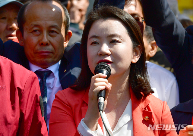 【광주=뉴시스】류형근 기자 = 3일 오전 광주 광산구 광주송정역광장에서 자유한국당의 '문재인 STOP! 광주시민이 심판합니다' 집회가 열린 가운데 신보라 청년최고위원이 발언을 하고 있다. 2019.05.03