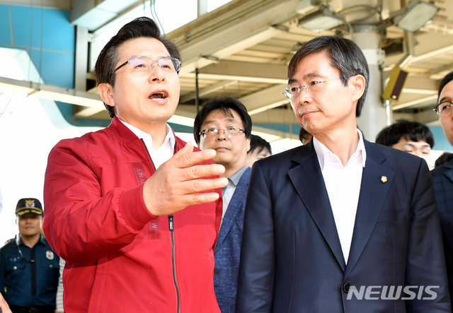 【광주=뉴시스】류형근 기자 = 자유한국당 황교안 대표가 3일 오전 광주 광산구 광주송정역광장에서 열린 '문재인 STOP! 광주시민이 심판합니다' 집회를 마친 뒤 돌아가고 있다. 2019.05.03