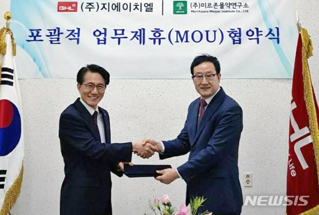 【서울=뉴시스】천연물질인 몰약(沒藥)을 전문 생산하는 바이오벤처 ㈜미르존몰약연구소(소장 김진우)가 의료기기, 헬스케어 전문기업인 (주)지에이치엘(GHL, 대표 신기영, 왼쪽)과 공동으로 기술 개발과 신제품을 개발키로 하는 업무협약(MOU)를 체결했다고 3일 밝혔다.