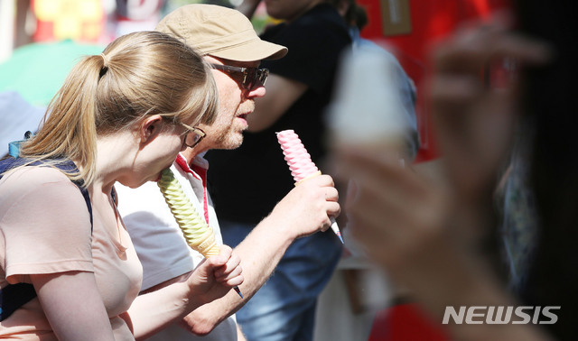 【서울=뉴시스】박미소 기자 = 초여름날씨를 보이는 3일 오후 서울 중구 명동 거리에서 외국인 관광객들이 아이스크림을 먹고 있다. 2019.05.03. [email protected]
