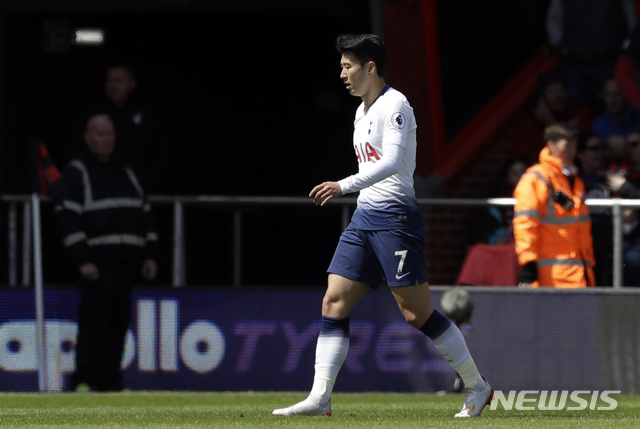 【본머스(영국)=AP/뉴시스】토트넘의손흥민이 4일(현지시간) 영국 본머스의 바이탤러티 스타디움에서 열린 2018-19 잉글랜드 프리미어리그 37라운드 본머스와의 경기 중 레드카드를 받고 경기장을 나서고 있다.