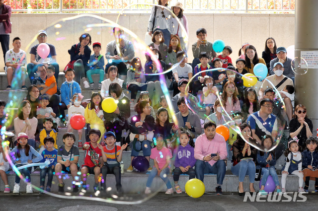 【서울=뉴시스】이윤청 기자 = 어린이날이 하루 앞으로 다가온 4일 서울 마포구청에서 열린 제9회 마포구 어린이대축제 '마포둥이 모여라'에서 가족 관람객들이 버블쇼를 즐기고 있다. 2019.05.04.
