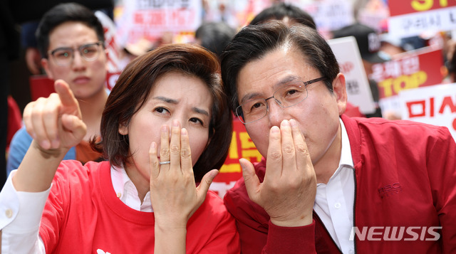 【서울=뉴시스】김선웅 기자 = 황교안 자유한국당 대표와 나경원 원내대표가 4일 오후 서울 종로구 세종문화회관 앞에서 자유한국당이 주최한 문재인 정권 규탄 3차 집회에 참석해 대화를 나누고 있다. 2019.05.04.