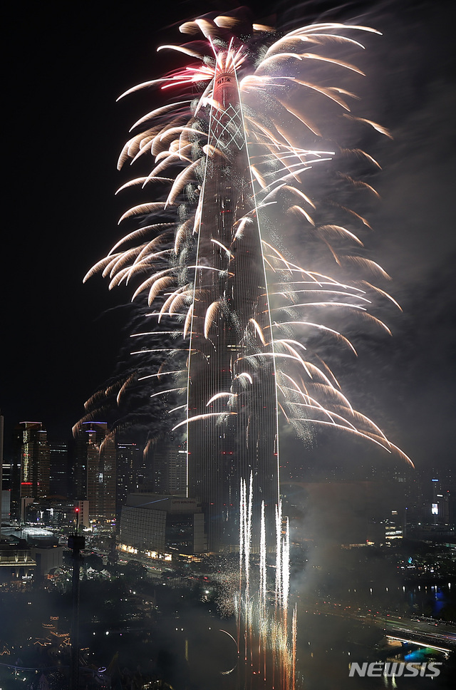 【서울=뉴시스】이영환 기자 = 4일 오후 서울 송파구 롯데월드타워에서 열린 '롯데월드타워 불꽃축제'에서 화려한 불꽃들이 타워 주위를 수놓고 있다.
