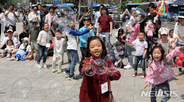 【서울=뉴시스】박주성 기자 = 어린이날인 5일 오전 서울 종로 보신각 앞에서 열린 '2019 어린이날 보신각 희망타종행사'에서 참석한 어린이들과 부모님들이 비누방울 공연를 즐기고 있다. 2019.05.05.