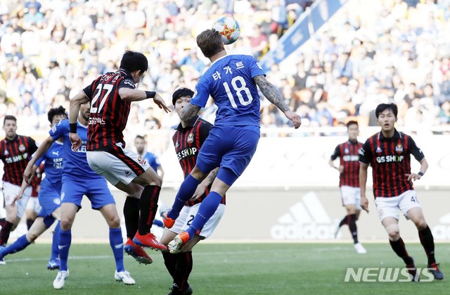 【수원=뉴시스】최동준 기자 = 5일 경기 수원월드컵경기장에서 열린 2019 K리그1 수원삼성 대 FC서울의 경기, 수원 타가트가 헤딩슛을 시도하고 있다. 2019.05.05. [email protected]