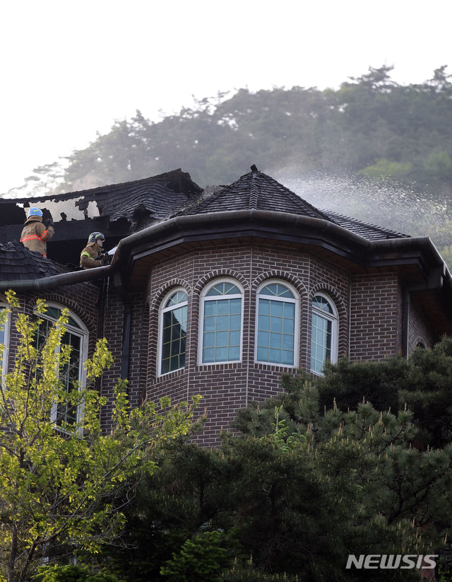 【서울=뉴시스】박미소 기자 = 5일 오후 서울 종로구 평창동 옛 사우디아라비아 대사관저에서 소방관들이 잔불정리를 하고 있다.