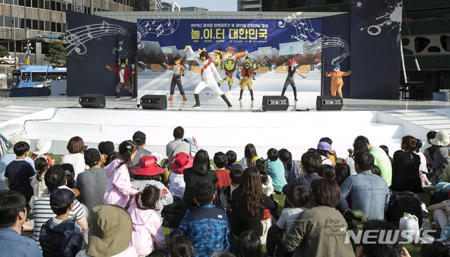 【서울=뉴시스】 어린이날을 맞아 진행 된 '2019년 제15회 어린이주간 및 제97회 어린이날 행사'에 애니메이션 런닝맨의 뮤지컬 공연이 서울시청 앞 광장 무대에서 진행됐다.