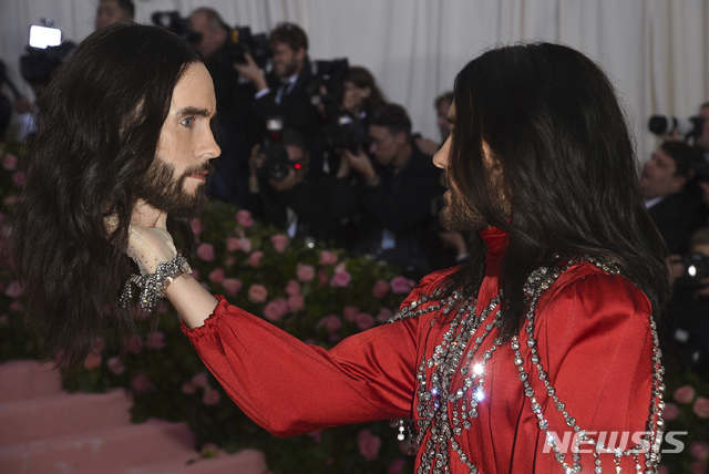 【뉴욕=AP/뉴시스】배우 겸 가수 자레드 레토가 6일(현지시간) 미국 뉴욕에서 열린 '캠프: 노트 온 패션'(Camp: Notes on Fashion) 전시회 개막 축하 자선행사인 '멧 갈라'(메트로폴리탄 미술관 코스튬 인스티튜트 갈라)에 참석해 자신의 두상 모형을 들고 포즈를 취하고 있다.