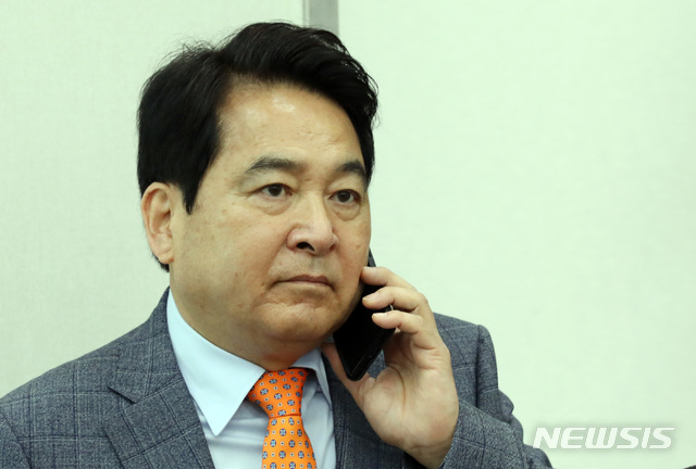 【서울=뉴시스】 박영태 기자 = 8일 오전 서울 여의도 국회에서 열린 자유한국당 원내대표-중진의원 연석회의에 참석한 심재철 의원이 누군가와 통화하고 있다. 2019.05.08. [email protected]