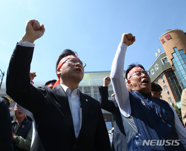 【속초=뉴시스】김경목 기자 = 이양수 자유한국당 국회의원(왼쪽)이 8일 오전 강원도 고성·속초 대형산불로 피해를 입은 속초시 이재민들이 강원 속초시 한국전력공사 속초지사 앞에서 집회를 갖고 정부와 한전에 선 보상 후 구상권 청구 등 실질 보상과 책임 보상을 촉구하고 있는 가운데 동참하고 있다. 2019.05.08.