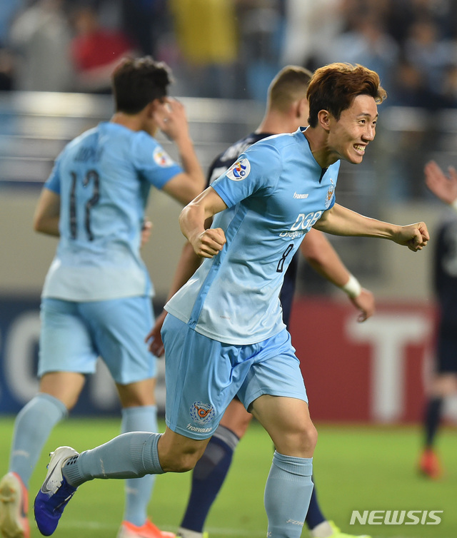 【대구=뉴시스】우종록 기자 = 8일 오후 대구 북구 고성동 DGB대구은행파크에서 열린 2019 아시아축구연맹(AFC) 챔피언스리그 F조 조별리그 5차전 대구FC 대 멜버른 빅토리 경기, 대구 정선호가 골을 넣은 후 포효하고 있다. 2019.05.08.