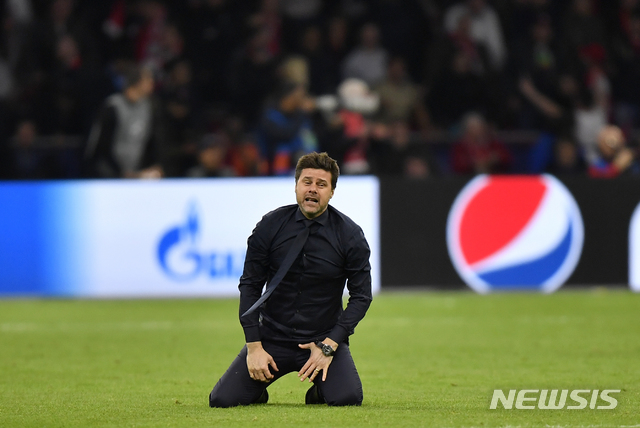 【암스테르담=AP/뉴시스】토트넘이 9일 오전 4시(한국시간) 네덜란드 암스테르담의 요한 크루이프 아레나에서 열린 아약스(네덜란드)와의 2018~2019 UEFA 챔피언스리그 4강 2차전에서 0-2로 뒤지다가 루카스 모우라의 해트트릭을 앞세워 3-2 역전승을 거뒀다. 1·2차전 합계에서 3-3으로 비겼지만 원정 다득점 원칙에 따라 토트넘이 결승에 올랐다. 창단 이후 첫 챔피언스리그 결승 진출이다. 토트넘의 포체티노 감독이 기쁨의 눈물을 흘리고 있다.