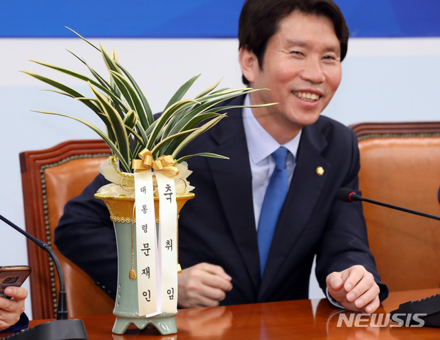 【서울=뉴시스】 박영태 기자 = 이인영 더불어민주당 신임 원내대표가 9일 오전 서울 여의도 국회 더불어민주당 원내대표실을 예방한 강기정 청와대 정무수석으로부터 문재인 대통령의 취임 축하 난을 받은 후 환하게 웃고 있다. 2019.05.09.
