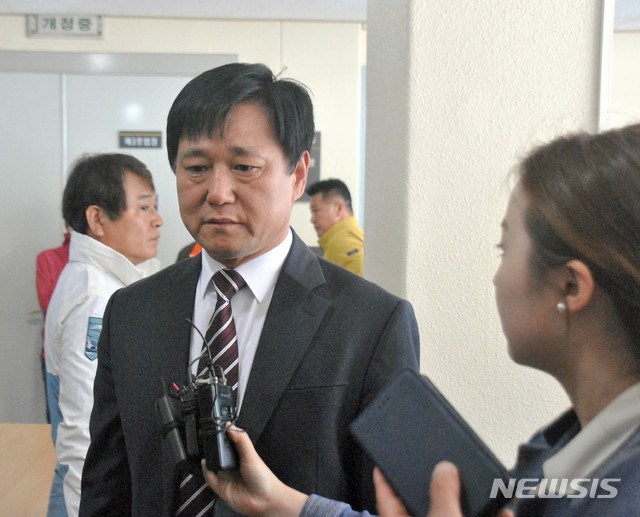 【상주=뉴시스】박홍식 기자 = 황천모 경북 상주시장이 10일 오후 공직선거법 위반 사건에 대한 1심 선고공판을 받기 위해 대구지법 상주지원 법정으로 들어가기 전 취재진과 인터뷰를 하고 있다. 황 시장은 "법의 심판에 따르겠다"고 말했다. 2019.05.10