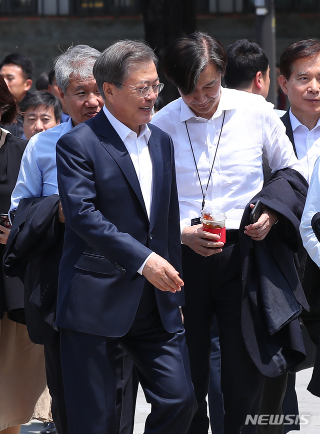 【서울=뉴시스】전신 기자 = 문재인 대통령이 10일 서울 종로구 삼청동 한 식당에서 참모진과 점심 식사를 마친 후 여민관으로 향하고 있다. 2019.05.10. [email protected]