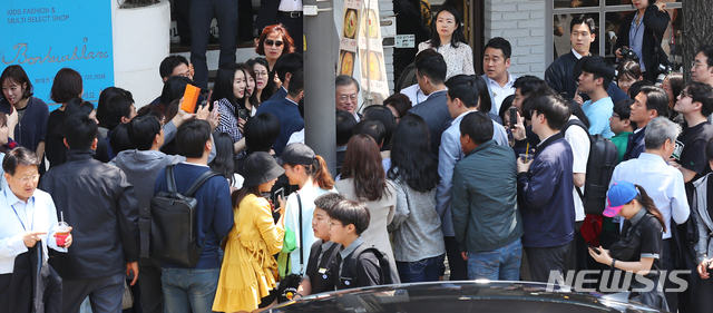【서울=뉴시스】전신 기자 = 문재인 대통령이 10일 서울 종로구 삼청동 한 식당에서 참모진과 점심 식사를 마친 후 나서며 시민들과 인사하고 있다. 2019.05.10.