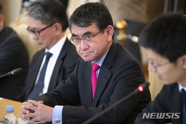 【모스크바=AP/뉴시스】고노 다로 일본 외무상이 10일(현지시간) 러시아 모스크바에서 개최된 러일 외무장관 회담에 참석해 세르게이 라브로프 러시아 외무장관의 발언을 듣고 있다. 2019.05.11.