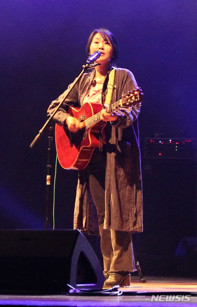 【구미=뉴시스】박홍식 기자 = 11일 오후 경북 구미문화예술회관에서 열린 '포크콘서트 5월의 향기'에서 싱어송라이터 박강수가 자신의 히트곡 '바람이 분다'를 부르고 있다. 2019.05.11