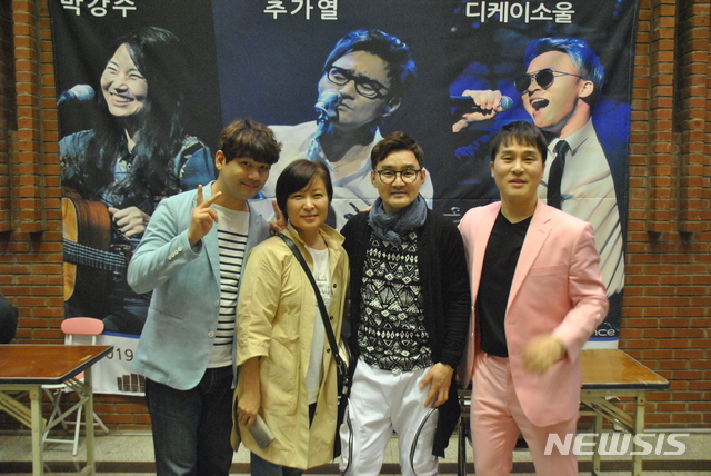 【구미=뉴시스】박홍식 기자 = 11일 오후 경북 구미문화예술회관에서 열린 '포크콘서트 5월의 향기' 공연을 마친 싱어송라이터 추가열, 디케이소울, 개그맨 김진철(왼쪽)이 한 팬과 기념사진을 찍고 있다. 2019.05.11