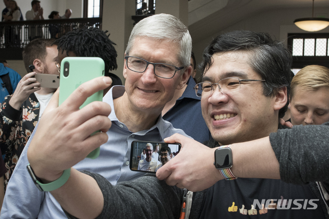 【워싱턴=AP/뉴시스】팀 쿡 애플 CEO가 11일(현지시간) 워싱턴DC 소재 카네기 도서관에 새로이 개점한 '애플 카네기 라이브러리'에서 방문 고객과 기념촬영을 하고 있다. 2019.05.12.