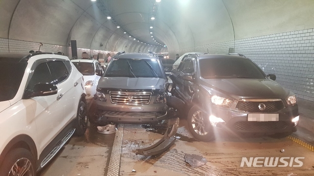 【울산=뉴시스】박수지 기자=12일 오후 4시17분께 울산시 동구 마성터털 출구 앞에서 남목 방향으로 운행하던 차량 7대가 잇따라 추돌하는 사고가 발생해 14명이 다쳤다. 2019.05.12. (사진=울산지방경찰청 제공)