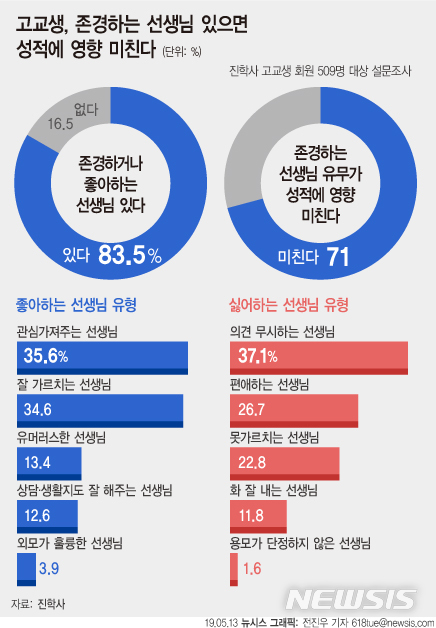 【서울=뉴시스】13일 입시전문업체 진학사가 조사한 설문조사에 따르면 고교생 71%는 교사와의 관계가 성적에 영향을 미친다고 생각하는 것으로 나타났다. 83.5%는 존경하거나 좋아하는 선생님이 있다고 응답했다. (그래픽=전진우 기자)
