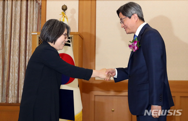 【서울=뉴시스】박미소 기자 = 김명수(오른쪽) 대법원장이 13일 오전 서울 서초구 대법원 본관 무궁화홀에서 열린 양형위원회 임명·위촉장 수여식에서 김영란 양형위원회 위원장에 위촉장을 수여한 후 악수하고 있다. 2019.05.13.