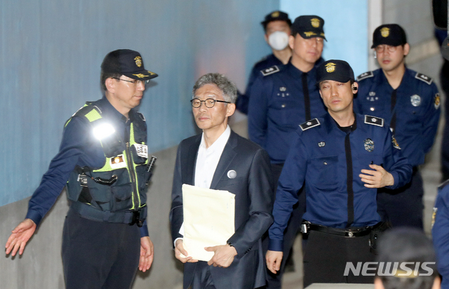 【서울=뉴시스】김병문 기자 = 서지현 검사를 성추행하고 인사보복을 한 혐의로 1심에서 법정 구속된 안태근 전 검사장이 14일 오전 서울 서초구 서울중앙지방법원에서 열린 항소심 3차 공판에 출석하기 위해 호송차에서 내려 법정으로 들어가고 있다. 2019.05.14.