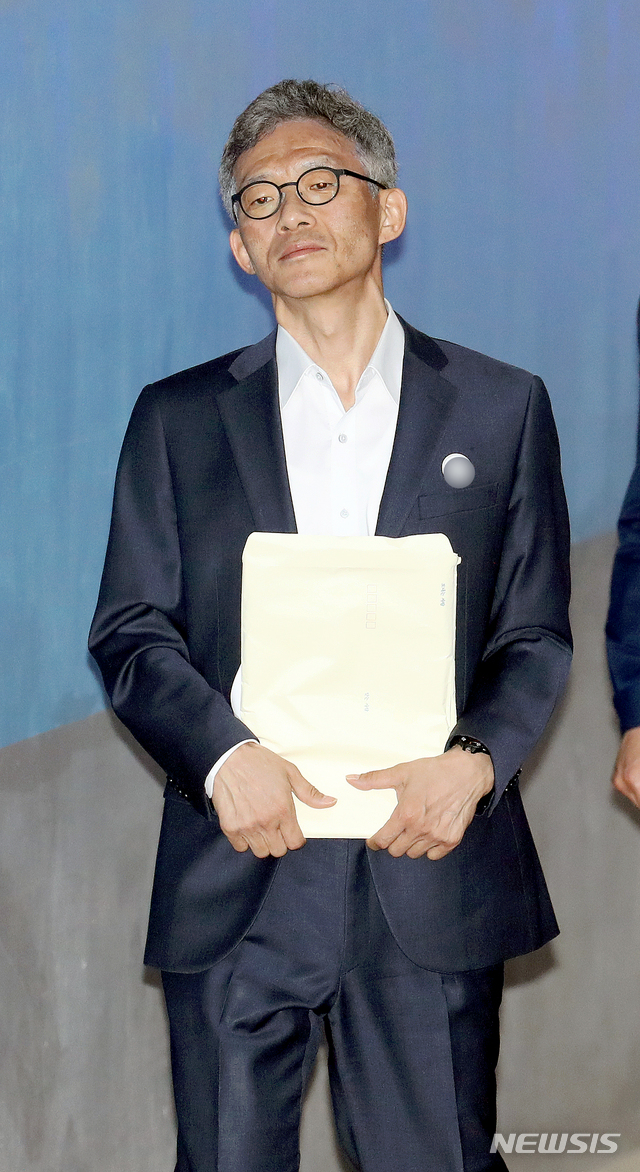 【서울=뉴시스】김병문 기자 = 서지현 검사를 성추행하고 인사보복을 한 혐의로 1심에서 법정 구속된 안태근 전 검사장이 14일 오전 서울 서초구 서울중앙지방법원에서 열린 항소심 3차 공판에 출석하기 위해 호송차에서 내려 법정으로 들어가고 있다. 2019.05.14.