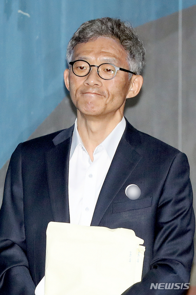 【서울=뉴시스】김병문 기자 = 서지현 검사를 성추행하고 인사보복을 한 혐의로 1심에서 법정 구속된 안태근 전 검사장이 14일 오전 서울 서초구 서울중앙지방법원에서 열린 항소심 3차 공판에 출석하기 위해 호송차에서 내려 법정으로 들어가고 있다. 2019.05.14.