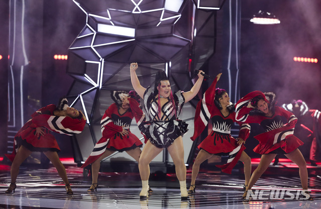 【텔아비브(이스라엘)=AP/뉴시스】14일(현지시간) 이스라엘 텔아비브에서 '2019 유로비전 송 콘테스트'가 열려 준결을 앞두고 지난해 우승자 네타 바르질라이(이스라엘)가 축하 공연을 하고 있다. 2019.05.15.