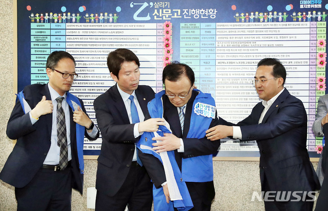【서울=뉴시스】이종철 기자  = 15일 서울 여의도 국회에서 열린 민주당 을지로위원회 '상생꽃달기' 및 '진짜 민생 대장정 : 2019 민생바람 출정식'에서 이인영 원내대표와 박홍근 을지로위원장이 이해찬 대표가 국회정상화 장조끼 입는것을 도와주고 있다. 2019.05.15.