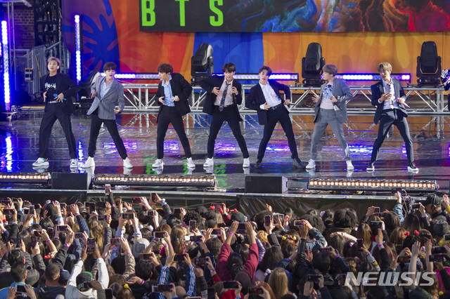 【뉴욕=AP/뉴시스】방탄소년단(BTS)이 15일(현지시간) 미국 뉴욕 센트럴파크에 위치한 대형 야외 공연장 럼지 플레이필드에서 공연하고 있다. 이 공연은 미국 ABC방송 아침 뉴스쇼 굿모닝아메리카(GMA) 주관으로 이뤄졌다. 2019.05.16