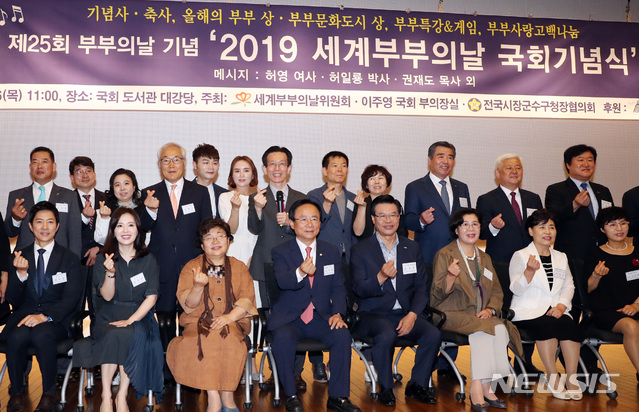 【서울=뉴시스】이종철 기자 = 16일 서울 여의도 국회도서관 대강당에서 열린 2019 부부의날 국가기념일 국회행사에서 이주영 국회부의장 부부와 올해의 부부상을 받는 최수종, 하희라 부부를 비롯한 수상자들이 하트를 날리고 있다. 2019.05.16.