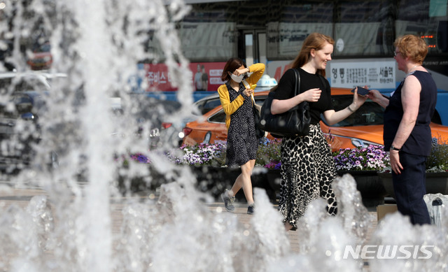 【서울=뉴시스】홍효식 기자 = 서울 등 일부 지역 낮 최고기온이 30도를 넘는 무더위를 보인 16일 서울 중구 서울광장 분수대에서 외국인들이 반팔과 빈소매를 입고 더위를 식히고 있다. 2019.05.16.