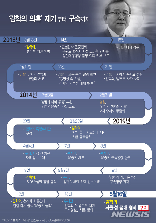 【서울=뉴시스】16일 김학의(63·사법연수원 14기) 전 법무부 차관이 뇌물수수 등 혐의로 전격 구속됐다. 지난 2013년 이른바 '별장 동영상' 의혹이 제기된 지 6년여 만이다. (그래픽=전진우 기자)