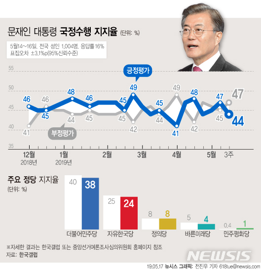 【서울=뉴시스】17일 한국갤럽은 5월 셋째 주 여론조사 결과 문재인 대통령의 직무수행 긍정평가가 전주 대비 3%p 내린 44%를 기록했다고 밝혔다. (그래픽=전진우 기자)