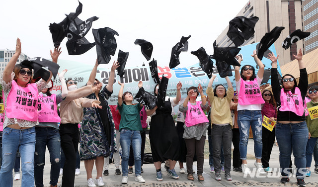 【서울=뉴시스】홍효식 기자 = 전국여성노조원, 한국여성노동자회원들이 17일 서울 종로구 광화문광장에서 열린 성별임금격차 해소를 위한 임금차별 타파의 날 기자회견에서 '가부장제, 남성생계부양자 이데올로기, 고용상 성차별' 등이 적힌 검은 천을 찢는 퍼포먼스를 하고 있다. 2019.05.17.