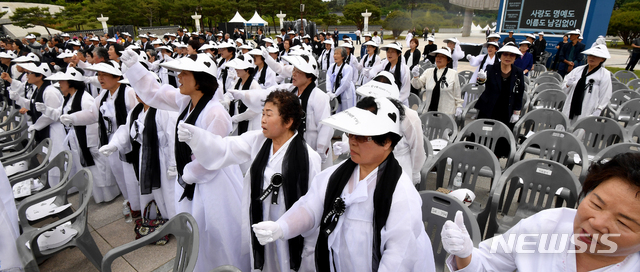 【광주=뉴시스】신대희 기자 = 5·18광주민주화운동 39주년 기념식을 하루 앞둔 17일 광주 북구 운정동 국립5·18민주묘지에서 5·18민주유공자유족회 주관으로 5·18민중항쟁 제39주년 추모제가 열리고 있다. 추모제에 참석한 오월 어머니들이 임을 위한 행진곡을 제창하고 있다. 2019.05.17.