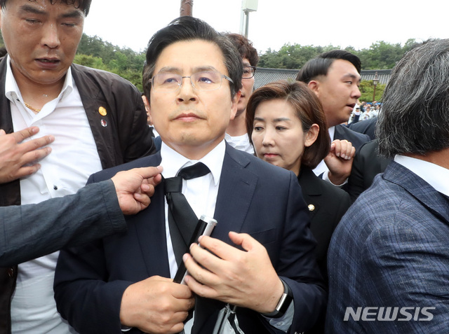 【광주=뉴시스】 박영태 기자 = 자유한국당 황교안 대표와 나경원 원내대표가 18일 오전 제39주년 5.18민주화운동 기념식이 열린 광주광역시 북구 국립 5.18민주 묘지 기념식장으로 들어가며 5.18 시민단체의 항의를 받고 있다. 2019.05.18.