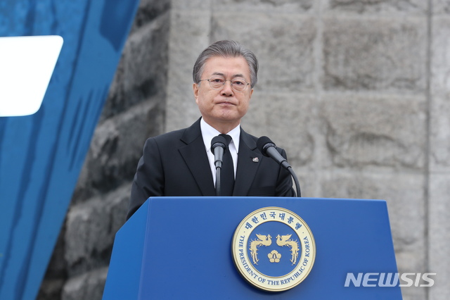 【광주=뉴시스】박진희 기자 = 문재인 대통령이 18일 오전 광주 북구 국립5·18민주묘지에서 열린 '제39주년 5·18민주화운동 기념식'에 참석하여 기념사를 하던 중 감정이 북받쳐 목이 메여 생각에 잠겨 있다. 2019.05.18.